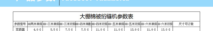 產(chǎn)品簡介:安徽省蕭縣徽星機(jī)械制造有限公司,已突破技術(shù)上的限制,獨(dú)立研發(fā)生產(chǎn)6米-8米型大棚被生產(chǎn)設(shè)備,領(lǐng)先國內(nèi)同行棉被機(jī)器制造業(yè)縫制的寬度水平,在全國絕無第二家的大棚被生產(chǎn)設(shè)備,動(dòng)力選用三項(xiàng)雙電機(jī)驅(qū)動(dòng),轉(zhuǎn)速可達(dá)140針/分鐘進(jìn)行縫合,針距可調(diào)整到1-4公分,縫紉厚度可達(dá)到3-5公分,每平方米重量達(dá)8公斤。